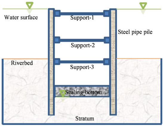 The steel pipe and the bottom seal in the cofferdam structure interact and are embedded in the stratum. The difference in hydrostatic pressure inside and outside the cofferdam can cause horizontal deformation of the pile body and uplift deformation of the bottom seal concrete. When the deformation is excessive, it can lead to cracks between piles and concrete cracks, and then lead to risks such as seepage and even piping failure, which are the main risks of the steel pipe pile cofferdam [1]. In addition, there are also potential risks of damage to the cofferdam structure caused by normal flow, flood, and surging, and potential risks under impact and scouring [27,28,29,30]. At the same time, the quality of underwater bottom seal concrete is difficult to guarantee, so it is impossible to guarantee that the thickness is consistent in all parts or that there is no defect in the interior.