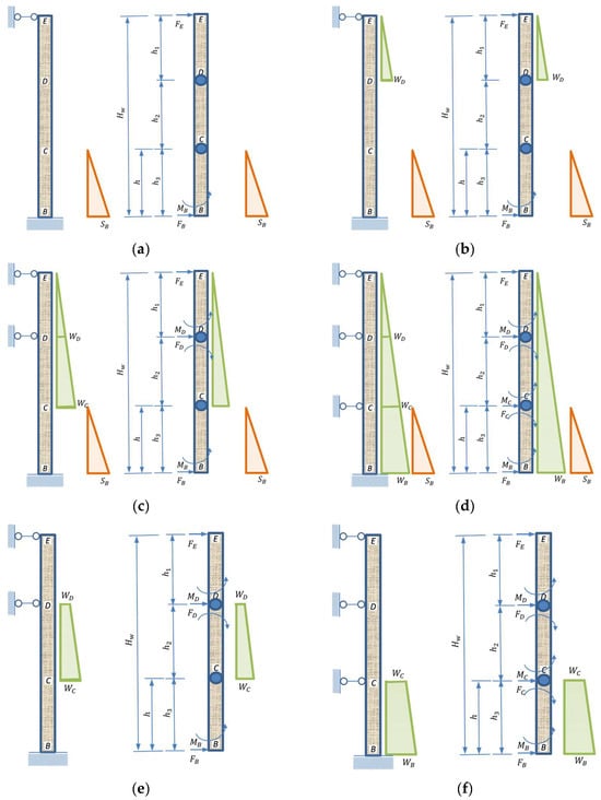 This incremental deflection (Equation (23)) is superimposed onto the Stage 2 (Equation (17)) and Stage 3 (Equation (20)) deflections to derive the total deformation. A full-load analysis based on Figure 3d is necessary to calculate the additional bending moment and horizontal load at end B.