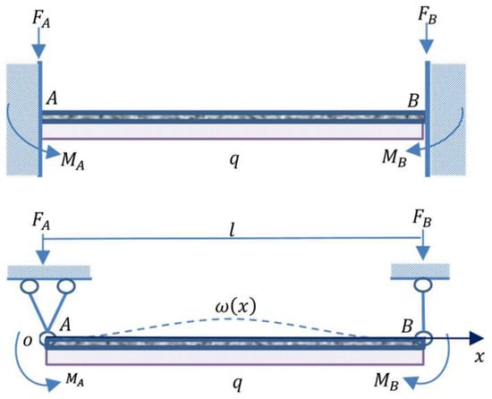 Substituting the force–rotation angle relationships Equations (1)–(3) for ①②③ working conditions into Equation (24), the fixed-end bending moments is derived. Taking support A as the coordinate origin and the beam axis as the x-axis, the bending moment at any position x along the fixed-end beam is as follows: