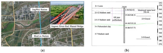 The theoretical framework developed in the preceding section is validated and applied to the steel pipe pile cofferdam foundation pit engineering of the 6# pier of the Jingwei River-Rail Shared Bridge of Xi’an Metro Line 10 (China), as shown in Figure 5a. The primary sub-riverbed soil layer at this site is medium sand, characterized by specific physical-mechanical properties and permeability, as shown in Figure 5b. As illustrated in Figure 5c, the 6# pier employs a Φ 820 × 16 mm interlocking steel pipe pile cofferdam with a 33 m pile length, 1 m spacing, and CT-type pile interlocks. The internal supports consist mainly of HN 900 × 300 and HM 550 × 300 H-shaped steel sections and Φ 630 × 10 steel pipes.