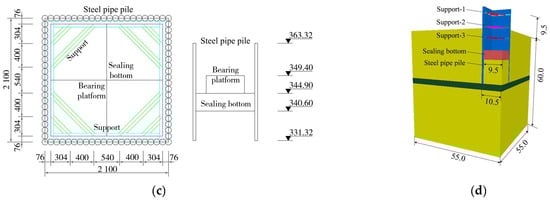 The steel pipe pile cofferdam is equivalent to a fixed-end multi-span continuous wall according to the bending characteristics, and the optimization of the section size or that of the steel pipe pile can be considered, which can optimize the amount of steel used while ensuring the deformation stability and safety of the steel pipe pile, thereby reducing investment [15,19,20]. The concrete bottom seal is equivalent to a fixed-end beam, and the thickness and grade of the bottom seal concrete can be considered, which can optimize the amount of concrete used while ensuring the deformation stability and safety of the bottom seal, thereby reducing investment.
