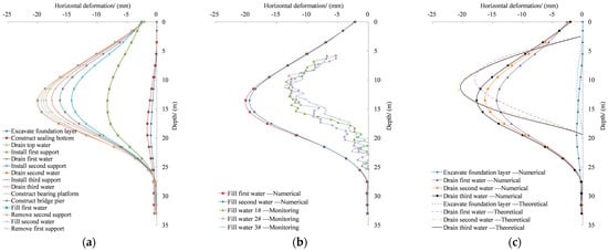 The horizontal deformation at different depths under each working condition exhibits a consistent convex profile along the depth direction, with an overall trend of increasing first and then decreasing as the construction progresses, as illustrated in Figure 6. Upon completion of the main pier construction, the maximum deformation of 20.72 mm occurs at a depth of 14 m below the pile top. The field-measured horizontal deformation reflecting the deep horizontal displacement of the soil outside the pile aligns well with the simulation and theoretical results in terms of deformation pattern, despite slight discrepancies in magnitude. This consistency is attributed to factors such as the actual external water level being lower than the design value during monitoring and the field construction progress entering the water refilling stage.