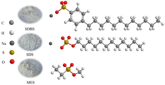 Three anionic surfactants were investigated: sodium dodecyl benzene sulfonate (SDBS), sodium dodecyl sulfate (SDS), and methyl ester sulfonate of fatty acids (MES). All surfactants were of analytical grade, with >99% purity. The appearance and molecular structure formulas of the surfactants are shown in Figure 1.