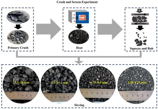 According to the Chinese standard technical specification JTG/T T5521-2019 [], RAP aggregates must be sieved into two parts before use. In this study, the CSE (crush and screen experiment) processing method was adopted, with the main purpose being to avoid the use of traditional mechanical processing, which can crush a large number of coarse aggregates and produce excess needle-like particles. In the CSE process, the large pieces of RAP are first dusted, then heated in the oven at 120 °C for 1 h, and finally kneaded and squeezed for separation. The CSE was used for the preliminary separation of the RAP aggregate, with the main purpose of separating the oversized particles (>16 mm) and then cooling them to obtain a large number of RAP clusters with different granular sizes.