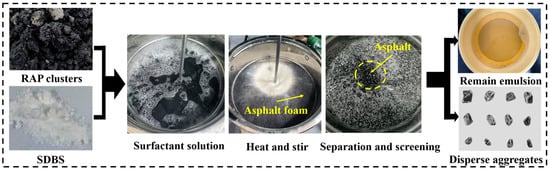 The emulsification–separation equipment used in this study was a mixing device modified from a drilling rig, where the drill bit of an ordinary drilling machine was replaced with a dispersion disk. For the emulsification–separation experimental process, the pretreated RAP was first preheated in an oven for about 30 min, during which time the emulsion was prepared. A certain amount of surfactant was weighed, poured into the tap water, stirred, and dispersed. After the RAP was preheated, it was gradually scooped into the container and stirred to disperse. During this process, the aggregates were placed near the container wall and were flipped and stirred every 10 min or so to sufficiently mix them. The asphalt foam and mineral foam in the upper layer of the emulsion surface were collected to prevent them from adhering again to the RAP. At the conclusion of the experiment, the aggregate was separated from the emulsion by sieving. After standing for 30 min, the emulsion was separated from the silt to obtain the recoverable residual emulsion. A flowchart of the emulsification–separation process is illustrated in Figure 3.