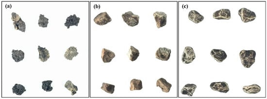 Aggregate images before and after RAP extraction and after emulsification–separation: (a) original RAP before extraction; (b) RAP after extraction; and (c) RAP after emulsification–separation.