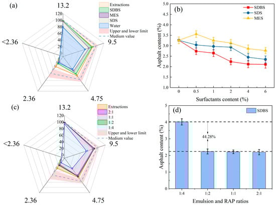 Influence of anionic surfactant type and content on oil removal efficiency. Types and contents of surfactants: (a) gradation, (b) asphalt content and SDBS emulsion/RAP, (c) gradation, and (d) asphalt content.