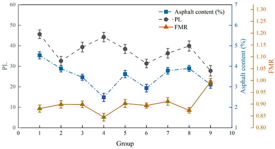 An orthogonal test was used to study the effect of three factors—namely, temperature, time, and speed—on the PL, FMR, and asphalt content of RAP. As shown in Figure 6, with a decrease in temperature, the asphalt content showed an increasing trend, the FMR was also relatively low, the PL showed an increasing trend, and the peak of the PL appeared. Under the condition of same the temperature, with an increase in time and speed, the PL and asphalt content showed a decreasing trend; the FMR gradually increased, indicating that the longer the processing time and the higher the speed, the better the separation effect on RAP and the more asphalt removed. However, the corners of the aggregates were severely abraded as the time and speed increased; so, subsequent experimental conditions must also consider the angularity of the aggregate. Intuitive analysis was used to characterize the influence of different conditions on the emulsification–separation effects and determine the optimal conditions.