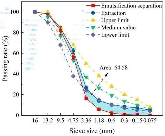 The AC-13 RAP aggregate process was conducted under the optimal conditions, as outlined in Section 3.2. A comparison was made between the process and the directly extracted grading curve. Under the optimal conditions shown in Figure 7, when the entire separation gradation curve was basically the same, we calculated the filling area between the emulsion sieve grading curve and the extraction grading curve, which had an area of 64.58. This indicated the emulsification of RAP sieving after false particle sizes were eliminated, but a gap in the aggregates below 4.75 mm existed, owing to the higher asphalt content. Thus, the emulsification–separation remained prone to agglomeration. To further optimize the experimental scheme, the effect of different particle sizes on the separation effect of RAP was refined. To further reduce the asphalt content and optimize the separation effect without increasing the cost and affecting the performance of the aggregates, the optimal RAP size was obtained by using the graded separation and its mixed separation comparison.