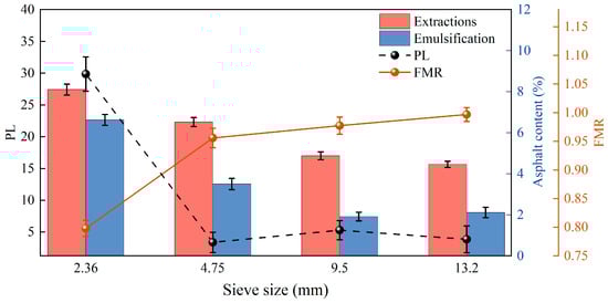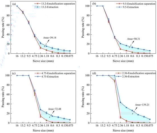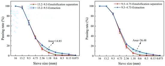 The purpose of separately processing RAPs of different sizes is to refine the specific separating effect of different particle sizes during emulsification–separation and to obtain the PL between different particle sizes, thus preparing for the subsequent separation of mixed particle sizes. The gradation curves in Figure 8 indicate emulsification–separation clusters of different particle sizes. When treating RAP above 4.75 mm, the emulsification passing rate is almost the same as the extraction passing rate, but there remains a gap. The filling area between the emulsification–separation sieve grading curve and the extraction grading curve was calculated. According to the results, the best treatment effect was achieved with 13.2 mm RAP, which has an area of only 39.14, whereas the area of 2.36 mm RAP is 139.21, indicating a significant difference between its grading curve and the extraction grading curve. To refine the specific variations of the different sizes in the mixed separation, the different particle sizes were progressively paired within emulsification–separation.