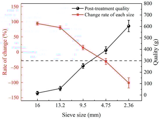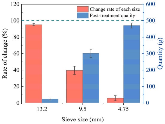 A total of 300 g of pretreated RAP of different sizes was removed from each aggregate size, and 300 g of oversized aggregates with a diameter of 16 mm or more was taken. A total of 1500 g of RAP was emulsified and separated, and the optimum separation conditions in Section 3.2 were selected to determine the change in mass, thereby obtaining the increase or decrease in conditions for each aggregate. We defined the ratio of the mass change of each agglomerate of the aggregate before and after emulsification as the rate of change. A positive rate of change meant that the mass of this grade of aggregate was decreasing; a negative rate of change meant that the mass of this grade of aggregate was increasing.