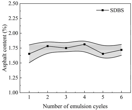 A large amount of emulsion was collected from the emulsification–separation process, which was crucial to achieving the recycling of the emulsion. We repeated the processing conditions in Section 3.2 to treat 9.5–13.2 mm RAPs mixed in a 1:1 ratio. The effect of the number of emulsion cycles on the asphalt content of the aggregate is shown in Figure 13. As the number of emulsion cycles increased, the asphalt content of the aggregate remained at about 1.7% and barely changed. This indicated that the main effect of the emulsion was to reduce the viscosity of the RAP and promote the formation of bubbles. As a result, the emulsion collected from the RAP emulsification–separation process could be reused in the system, achieving zero effluent discharge.