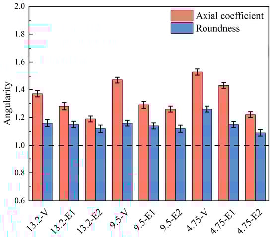 After extraction–separation, the original aggregate had a relatively large axial ratio, which indicated a good needle-like property, which decreased after secondary emulsification–separation. The angularity between the aggregates deteriorated through extrusion and kneading and gradually tended to be spherical. As seen in Figure 14, the preliminary emulsification–separation RAP aggregate had a slight decrease in angularity, and its axial ratio was relatively small compared to the extracted aggregate, but the average reduction was only about 0.1. However, the sharpness of secondary emulsification–separation significantly decreased, and the 4.75 mm aggregate decreased by 0.3, approaching the critical value. Therefore, it is not recommended to carry out secondary emulsification–separation.