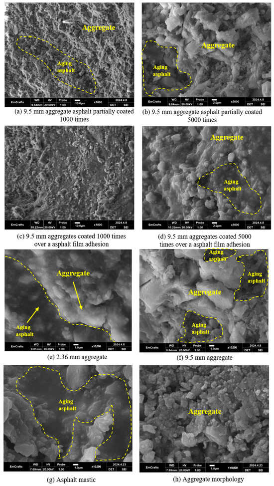 In Figure 15e,f, the 2.36 mm aggregate is completely wrapped by asphalt, and only part of the aggregate is exposed on the aggregate surface. The 9.5 mm aggregate’s morphology on the surface of the coarse aggregate is largely exposed. Figure 15g,h, illustrates that the asphalt part and the aggregate part of the aggregate surface are enlarged separately, which can be seen more closely, indicating the two adhesion patterns of the asphalt mortar and the aggregate. The black part is asphalt, and at 10,000 times magnification, asphalt is seen to adhere to the surface of some white aggregates.