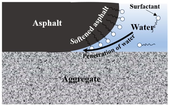 In Figure 16, it can be observed that, after using anionic surfactants to formulate emulsions, the water–oil amphiphilicity of the surfactant in the emulsion effectively reduced the mutual exclusion phenomenon between the hydrophilic group of the surfactant and the hydrophobic pollutants and improved the solubilizing ability of the emulsion on the pollutants. The solubilizing effect of the lotion on the aged asphalt of the RAP surface gradually softened the asphalt. Then, as water penetrated, the adhesion between the aged asphalt and the aggregate was weakened, causing the asphalt to separate from the aggregate surface. The emulsification–separation method proved its effectiveness by destroying the colloidal structure of the aged asphalt with surfactants. It is recommended to apply it to modified asphalt, different types of matrix asphalt, etc. Its basis is derived from its amphiphilic molecular structure and its adsorption behavior at the interface. The specific effects of different materials will be explored in future research. The surface polarity of stone materials, such as basalt or granite, is strong, leading to an increase in reagent consumption, but the effect and change rule after treatment are basically the same as those of limestone.
