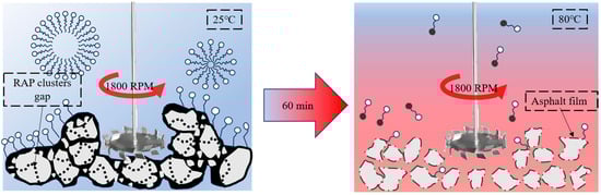 The separation of asphalt and aggregate depends on the balance between the force separating the asphalt and aggregate and the force combining the asphalt and aggregate. This step is influenced by various factors, including temperature, processing time, stirring speed, etc. Figure 17 shows the mechanism of the process affecting the separation effect.