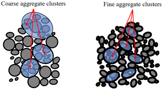 Promoting higher content percentages of RAP used in pavement engineering has drawn the attention of researchers [,]. However, one problem relating to the use of a higher RAP content is the agglomeration effect. The agglomeration of RAP aggregates is attributed to the viscoelastic effect of old asphalt, where the fine RAP aggregates agglomerate into coarse RAP aggregates, leading to the creation of RAP clusters. RAP clusters cannot be completely separated during asphalt pavement milling []. The RAP cluster phenomenon during the cold milling of asphalt pavements has been investigated, and the cold milling method was determined to inevitably cause RAP clusters []. Currently, the mix design of reclaimed hot mix asphalt mixtures (RHMAs) does not take into account the effect of RAP clusters [,]. Navaro et al. have argued that, even if a rejuvenator is added, RAP aggregates are difficult to disperse completely during the mixing process []. Pan et al. concluded that when the RAP content exceeded 30%, the actual and design grade difference would be enlarged due to the agglomeration effect of RAPs []. Therefore, the agglomeration effect is considered a phenomenon that negatively affects recycled asphalt mixtures [].
