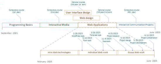 In the second year, the Interactive Media course helped students acquire knowledge and skills required for interacting with narrative artistic elements using web technologies such as HTML5, CSS, and JavaScript and physical art installations based on Arduino components. In the 3rd year, the students were taught several elective courses dealing with the creation of web artifacts from different perspectives. During the first semester, the User Interface Design and Web Design courses provided a front-end perspective focused on visual aspects and introducing UI (User Interface) notions. The Web Applications (WA) course took place during the second semester and included topics related to back-end aspects that complemented the previously presented front-end perspective in the Web Design course (considered a recommended course). In the 4th year, there was a final compulsory course that promoted the integration of web and XR (extended reality) technologies into the production of interactive UX (user experience) projects. Naturally, other courses were taken over the course of this degree. The courses mentioned in Figure 1 were strongly connected with the WA course, which is the main research target.