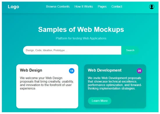 Figure 4 shows an example of a generic mockup based on templatetemo designs (https://templatemo.com/, accessed on 28 May 2025) that displays a sample web homepage composed of two main parts. In the upper area, the header contains a “Logo” title on the left side and a horizontal navigation menu with options such as Home, Browse, How it Works, Contact, and Pages, along with a user icon (enabling sign-in actions). The central part of the Homepage features a Hero section with a main title and a subtitle complemented by a search component and some card samples. The students could download this mockup image in a graphic format. The first experiment conducted to test the use of GenAI tools involved providing the students with a prompt template skeleton with some relevant web design aspects they were tasked with completing. Table 2 shows a list of aspects the students could use to prompt ChatGPT, a well-known GenAI tool.