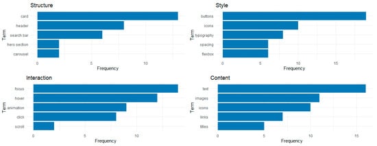 Figure 5 shows a plot of four bar charts that display the frequency of terms categorized by the items defined in Table 2. These charts were obtained from the responses of nine students who experimented using the proposed prompt skeleton and completed the main web components described in the template. Regarding the Structure category, the most mentioned term by the students was Card, which represented a suitable unit for organizing content items. In the case of the Style category, the students were mostly concerned with the visual appearance of buttons, and Focus was selected as the favorite concept for capturing user attention. The last category was Content, in which Text was the recurrent term.