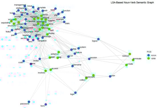 A second set of results was obtained by gathering the outcomes derived from interactions between the students and the GenAI mechanisms (GitHub Copilot-assisted). These outcomes were based on two data sources: (i) the set of development artifacts produced by the students during their learning activities and (ii) the collection of chat logs derived from the GenAI interactions and exported as JSON files. These AI-based learning activities were a form of support for task completion (scheduled in Figure 1), and the rate of completion of these tasks was also computed. Before reviewing the associated academic results, a careful analysis of chat logs was performed, beginning with the visualization of extracted terms (e.g., nouns and verbs) and their relationships. Figure 6 shows an example of a graph displaying the relationships between the verbs represented in the prompt benchmark (green points) and the entity nouns involved (blue points) for the Template-Session task benchmark (see Appendix A). The resulting graphs displayed two different areas. The first, located in the upper -left corner, showed a dense network of concepts with generic entities such as “html”, “php”, or “function (located on the right-hand side of this area) and references to web components such as “header”, “section”, “navigation”, and “menu”. The second main area was located in the lower part of Figure 6, displaying more sparsely distributed relationships among entities that are more specific in the context of the target task, such as “session”, “username”, and “login”. Importantly, this type of graph could be useful as a support for comparing the relationship patterns exhibited by student–AI interactions (through their associated chats) and the task benchmark, a visual reference of which is displayed in Figure 6.