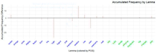 However, this graphical representation was difficult to use as an instrument for measuring the quantitative distance between the provided benchmark (which, in this case, is associated with the Template-Session task) and the outcomes obtained by the students in their chat logs. Instead, alternative instruments were used, such as those reported in the Data Analysis subsection (see Figure 3). For example, the computed term frequencies gathered from student chats were compared with the terms found in the task benchmark. This process is depicted in Figure 7, which shows the distribution of differences in the frequency of terms identified as lemmas by comparing the frequency of lemmas in student chats against the selected terms in the Template-Session task benchmark. This comparison is divided by lemma POS (Part of Speech) entities, such as nouns (displayed in blue) and verbs (in green). The accumulated frequency values for verbs did not show remarkable differences in student-based outcomes compared to the provided benchmark. However, notable discrepancies emerged for terms such as “session” or, especially, “login” with high negative accumulation (fewer than −20 occurrences), indicating that this particular concept was underestimated or neglected by the students in their chats.