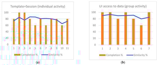 Comparison of semantic similarity rates and task completion degrees. (a) Template + Session (individual activity); (b) UI access to data (group activity).