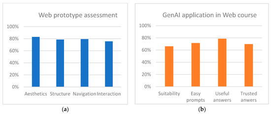 As the final part of this assessment stage, two questionnaires were used to collect feedback from users. The first one was administered to students in the Interactive Communication Projects (ICP) course (a fourth-year course) who examined web prototypes developed by WA groups. There were more students (about forty) in this course, and their projects were unrelated to those worked on by the WA students. Seven web projects were tested by 27 students (with a range of three to five evaluations per project). Figure 9a displays a bar chart that shows the results for four of the assessment criteria used for testing the web prototypes developed. These results were obtained by averaging the ICP students’ answers, revealing assessment values close to 80% in three categories, although the Interaction category received a lower score. The full list of questions is available in Appendix B. A second questionnaire (see Appendix C) was used to gather the WA students’ perceptions regarding the application of GenAI tools in their course. The bar chart in Figure 9b displays the average answers from fourteen students in four assessment categories that measured the suitability of applying GenAI, the ease of producing prompts in the course context, and the usefulness of and trust levels regarding the GenAI outcomes obtained. None of the assessed categories reached 80% agreement, and only 62% of the students, on average, provided positive opinions regarding the suitability of GenAI use during the course.