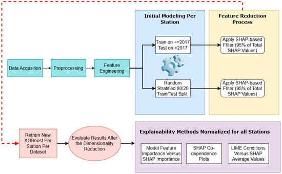 Our full methodology pipeline is described in the flowchart in Figure 1. The approach follows the structure of the paper step by step (from data acquisition to final XAI method application). The approach follows three core principles: the initial modeling which consists of the flat modeling approach, the SHAP-based dimensionality reduction, and finally the explainability that enhances the evaluation of results to a more implicit level of interpretation.