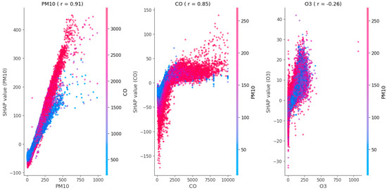 The O3 subplot exhibited a weaker and more variable trend. There was a modest negative relationship between ozone levels and SHAP values, suggesting that in some contexts, higher ozone levels may slightly reduce PM2.5 predictions, probably suggesting the suppression of household heating as an emission mechanism during the warmer period of the year. However, the color encoding again pointed to PM10 as a key modulating factor. These more nuanced effects highlight the model’s capacity to detect context-dependent behaviors and demonstrate how SHAP can uncover relationships that may be both subtle and dynamic in real-world environmental systems [5,11].