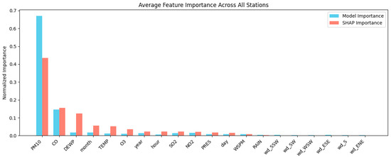 To investigate the agreement between the model-internal and explainability method’s explanations, we computed the normalized average importance of each feature using both XGBoost’s gain-based importance and SHAP values, aggregated across all stations. The results, presented in Figure 3, illustrate the relative contribution of each feature to the estimation of PM2.5 concentrations.