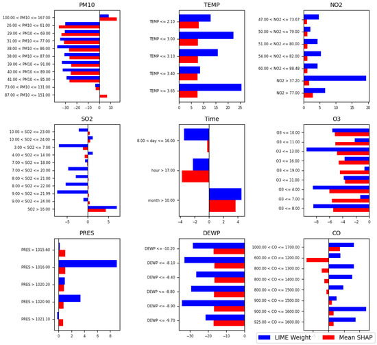 For this reason, in Figure 4, a comparison of LIME and SHAP values is presented, taking into account different conditions (features and feature value ranges) used in a predictive model, therefore identifying how each feature contributes to the model’s output. The y-axis lists specific conditions or value ranges for our environmental features (e.g., SO2, PM10, CO, and TEMP), while the x-axis shows their corresponding influence values: blue bars represent LIME weights, and red bars represent mean SHAP values across all stations on average. Several key features show strong agreement between LIME and SHAP, both in direction (positive or negative) and approximate magnitude. For example, “TEMP ≤ 3.65”, “TEMP ≤ 3.10”, and “TEMP ≤ 3.00” have consistently high positive values in both LIME and SHAP, indicating that low temperature conditions are strongly associated with increased PM2.5 concentration estimations both locally (individual cases) and globally (on average across the dataset). Similarly, high PM10 levels (e.g., “38.00 < PM10 ≤ 86.00”, “39.00 < PM10 ≤ 91.00”) also show a strong positive influence in both methods, marking them as significant predictors.