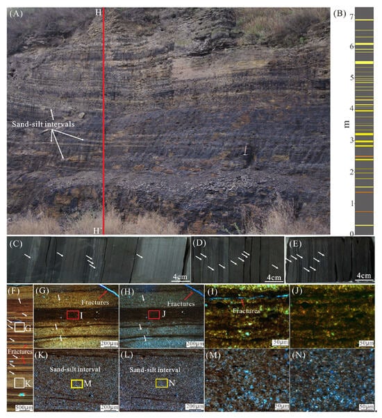 Photographs of sand-silt intervals and organic-rich intervals in Yanchang shale. (A) Sand-silt intervals in Yanchang shale of outcrop in Tongchuan. (B) The sand-silt intervals (yellow) in section H-H′, with the orange areas representing tuff and the dark grey areas representing mudstone; location is shown in (A). (C–E) Core photographs displaying even, lens-shaped, and wavy silty laminae and intervals, well Y10. (F–H) Thin-section image of sand-silt intervals and organic-rich intervals in Yanchang shale, well Y11. (I,J) Thin-section images of organic-rich intervals. (K–N). The white arrows indicate the sand-silt intervals. Images (F,G,I,K,M) are under transmitted light, while (H,J,L,N) are under cross-polarized light.
