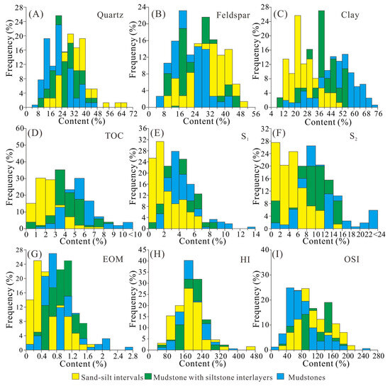 Histograms showing the quartz (A), feldspar (B), clay mineral (C), TOC (D), S1 (E), S2 (F), EOM (G), HI (H) and OSI (I) of mudstones, sand-silt intervals, and mudstones with interlayers.