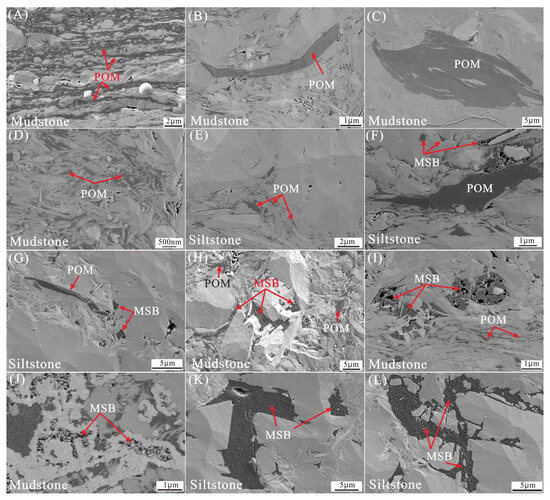 The areas of primary POM and MSB were measured based on SEM images using Image-Pro Plus 6.0 software, and the proportions of POM and MSB areas to the total organic matter area were calculated by Equations (1) and (2).