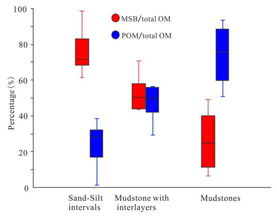 Box plots of the proportion of POM and MSB to total OM in mudstones, mudstones with siltstone interlayers, and sand-silt intervals.