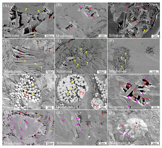 SEM photographs showing interP and intraP pores. (A) Primary interP pores and intraP pores, well Y8. (B) Primary interP pores and dissolution pores, well Y8. (C) Primary interP pores in clay platelets and intraP pores in clay aggregates, well Y11. (D) Primary interP pores in clay platelets and siderites, and intraP pores in clay aggregates, well Y5. (E,F) IntraP pores in clay aggregates, well Y8. (G) IntraP pores within pyrite aggregates, well Y10. (H) IntraP pores within pyrite aggregates, well W3. (I) Dissolution pores within feldspar, well W3. (J) Dissolution pores of siderite, interP pores, and intraP pores, well Y5. (K) Cleavage and dissolution pores in feldspar, well W3. (L) Dissolution pores in feldspar and siderite, well Y10. Red arrows—interP pores, yellow arrows—intraP pores, purple arrows—dissolution pores.