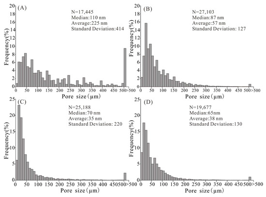 Histograms of pore sizes measured from SEM images. (A) Pore size distribution of inorganic pores of sand-silt intervals. (B) Pore size distribution of OPs of sand-silt intervals. (C) Pore size distribution of inorganic pores of mudstones. (D) Pore size distribution of OPs of mudstones.