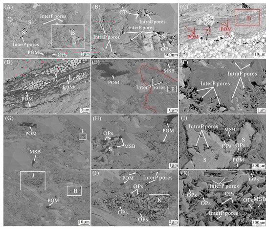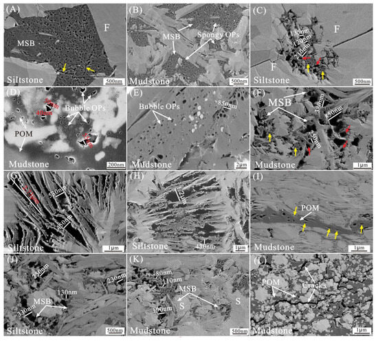 OPs are rare in most of the primary organic matter (POM) in the Yanchagn shale (Figure 5A–E). However, in some parts of the POM, bubble-like, spongy pores and shrinkage seams can be observed (Figure 6F and Figure 10D,I). Circular, subcircular, polygonal, and irregular spongy OPs are relatively common within the MSB of the Yanchang shale, with pore sizes generally less than 100 nm (Figure 6H–L and Figure 10A–C,F,J,K). Circular, subcircular, and oval bubble-like OPs in the MSB have significantly larger pore sizes compared to those of spongy OPs (Figure 10). Most of these bubble-like pores have diameters greater than 50 nm, and pores with sizes in the hundreds of nanometers are also relatively common (Figure 10D–F,J,K). Additionally, some bubble pores and spongy pores are interconnected, forming a complex organic pore network (Figure 10C,F,J,K).