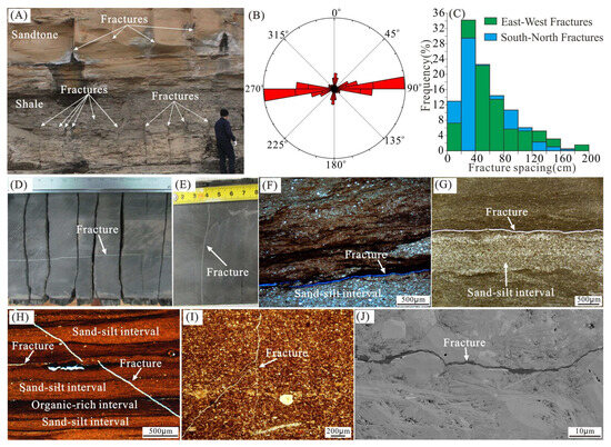High-angle fractures, low-angle fractures, and fractures parallel to bedding are observed in the Yanchang shale at outcrop, core, and pore scales (Figure 11). The high-angle fractures are primarily structural joints, with dips generally greater than 75° (Figure 11A,D). These predominantly trend in the near east–west direction (approximately 260~280°), and some north–south-trending (approximately 0°~20°) high-angle fractures, nearly perpendicular to the east–west trending fractures, can be observed in the Yanchang shale (Figure 10B). The spacing for the east–west-trending high-angle fractures ranges from 6 to 174 cm, with an average of 54 cm (Figure 11C). In contrast, the pacing of the north–south-trending high-angle fractures ranges from 10 to 228 cm, with an average of 62 cm (Figure 11C).