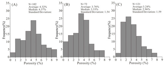 Histograms of porosity. (A) Sand-silt intervals. (B) Mudstone with siltstone interlayers. (C) Mudstones.