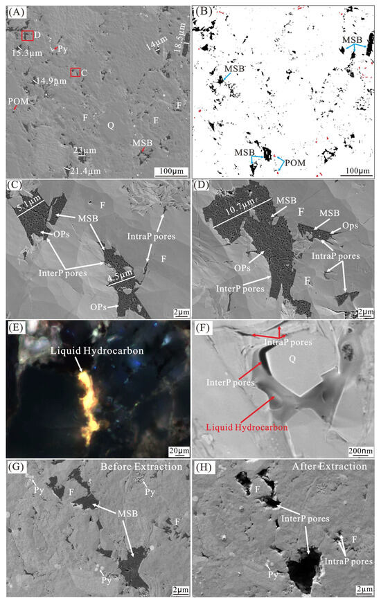 Photographs of pores, organic matter, and liquid hydrocarbons in the sand-silt interval from well Y2. (A) SEM image showing inorganic pores and organic matters. (B) Image showing POM (red color) and MSB (black color). (C,D) SEM images showing MSBs filling inorganic pores; the location of (C,D) is shown in (A). (E) Thin-section image under UV light showing liquid hydrocarbons. (F) SEM image showing liquid hydrocarbon filling interP pores. (G) SEM image showing inorganic pores and OMs before extraction. (H) SEM image showing inorganic pores after extraction.