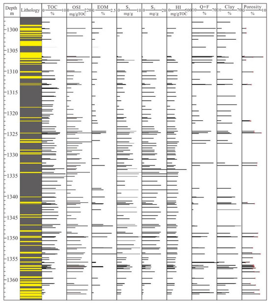 Compared to mudstones, sand-silt intervals have relatively lower contents of TOC, S1, S2, HI, and extractable organic matter (EOM) but a relatively higher oil saturation index (OSI = [S1/TOC] × 100; see Table 1). The TOC in sand-silt intervals varies from 0.39% to 7.36%, with an average of 2.32%, which is lower than that of mudstones (ranging from 1.37% to 20.27% and averaging 5.86%). Similarly, the S1 and S2 values in sand-silt intervals range from 0.17% to 6.86% (averaging 2.29%) and from 0.25% to 15.22% (averaging 4.44%), respectively. These values are lower than those of mudstones, which range from 1.24% to 13.09% (averaging 4.37%) and 0.39% to 48.29% (averaging 11.52%), respectively. The average values of EOM and HI in sand-silt intervals are 0.6% and 181 mg/g TOC, respectively, which are lower than those in mudstones (0.89% and 197 mg/g TOC, respectively). Meanwhile, the OSI of sand-silt intervals ranges from 21 to 212 mg/g TOC and averages 105 mg/g TOC, which is greater than that of mudstones (ranging from 10 mg/g TOC to 247 mg/g TOC and averaging 82 mg/g TOC; see Table 1). The geochemical parameters of mudstones with interlayers are intermediate between those of sand-silt intervals and mudstones (Table 1, Figure 5).