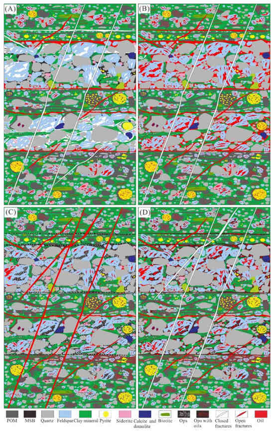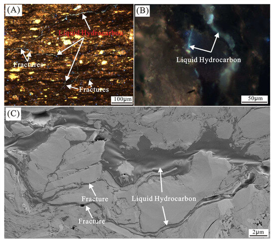 A large number of fractures can be observed in organic-rich shales [25,40,41,42,43,44,45,46], which are often filled with liquid hydrocarbons and solid bitumen [25,42,43,47]. Hydrocarbon inclusions can also be observed within the fillings of some fractures [40,42,48,49]. The formation, growth, and eventual interconnection of micro-fractures to create a micro-fracture network have been observed through oil generation and expulsion modeling [17,46,50,51]. By comparing the changes in matrix permeability and fracture permeability of shale samples before and after oil generation and expulsion experiments, it has been concluded that the fracture network is the most important pathway for primary migration [17,46,50,51]. However, the number, length, and width of fractures in shales are relatively limited, and their total volume is small [13,41,52]. Lash et al. [41] noted that micro-fractures in shales can form local fracture networks, but on a larger scale, these networks may be isolated from one another. Moreover, some fractures cemented by calcite and quartz show no signs of oil migration [17,43]. There is a significant difference between the total volume of micro-fractures and the amount of free hydrocarbons retained in source rocks [13,41]. This suggests that, in addition to micro-fractures, there are other pathways for primary migration within source rocks.