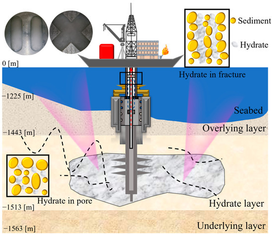 Natural gas hydrate is a metastable substance formed by the interaction of water molecules with guest molecules [1,2], primarily methane (CH4), under low-temperature and high-pressure conditions, resulting in a cage-like, solid crystalline compound [3,4]. It is widely distributed across offshore areas and permafrost regions [5,6]. As an unconventional energy source, the carbon reserves of natural gas hydrates are more than double those of conventional energy sources, and they release only small amounts of water and carbon dioxide (CO2) upon complete combustion [7,8]. Based on these advantages, natural gas hydrates are expected to become one of the most promising alternative energy sources as conventional energy gradually depletes [9,10]. Therefore, the large-scale commercial exploitation of natural gas hydrates is of considerable importance in addressing the issues of insufficient conventional energy reserves and environmental pollution [11,12].