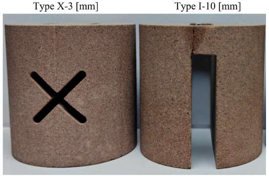 The materials required for this study primarily consist of CH4 gas, N2 gas, de-aerated water, L-tryptophan solution, and artificial sandstone fracture molds. The purity of the CH4 and N2 gases is 99.99%, and these are supplied by Xuzhou Luyou Co., Ltd., Xuzhou, China. The laboratory-produced de-aerated water is employed to eliminate potential interference from dissolved impurities during the formation of CH4 hydrate. To accelerate the rate of hydrate formation, a 0.2 wt% L-tryptophan solution is selected as the kinetic promoter [51]. The L-tryptophan solution is prepared in-house by dissolving high-purity L-tryptophan powder in de-aerated water to precisely control the concentration and ensure the effective control of the kinetic promoter. Additionally, based on prior research, a disturbance rate of 500 rpm is selected to facilitate the formation of the hydrate. The main components of the artificial sandstone are quartz sand (50.6%), low-sodium feldspar (21.2%), kaolinite (14.3%), and biotite (13.9%), with a density of 2.38 g/cm3. The specific artificial sandstone fracture model is shown in Figure 3.