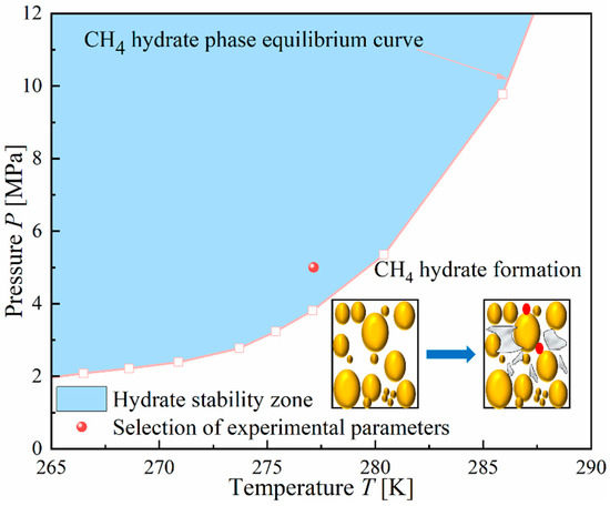 In the experiment, the primary factors considered are the fracture width, fracture shape, and roughness. The fracture widths employed are 3 mm, 6 mm, and 10 mm. The fracture shapes are Type I and Type X. The pore pressure is set at 5 MPa, and the fracture roughness is controlled by attaching glass beads to the fracture walls, with roughness values of 2.5 mm and 3.5 mm employed. The temperature gradient during formation and the CH4 hydrate phase equilibrium conditions are considered (as shown in Figure 4). The experimental temperature is kept at 4 °C. The specific experimental conditions are presented in Table 1.