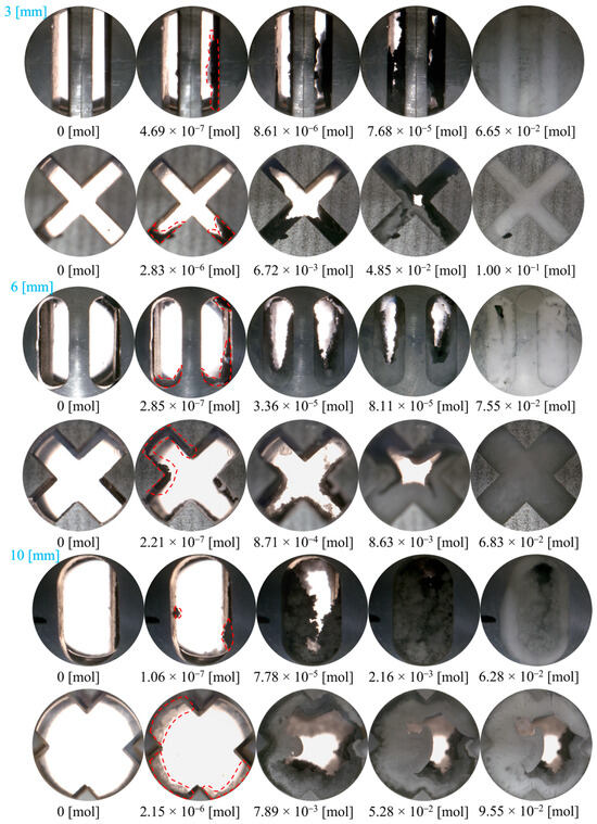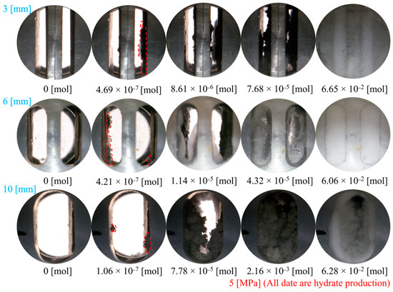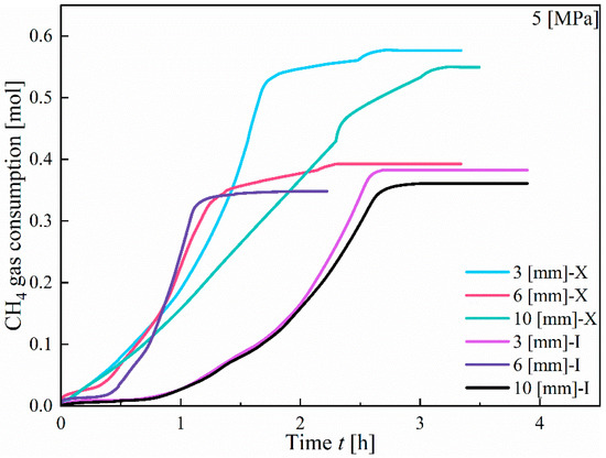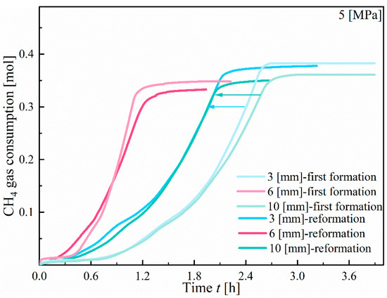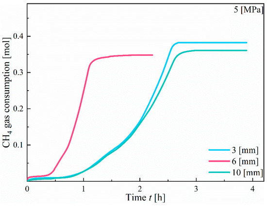 Figure 5b illustrates the total formation duration for different fracture widths. It demonstrates a trend of initially increasing, followed by a decrease as the fracture width increases. This phenomenon may be attributed to the fact that under lower pressures, the hydrate phase equilibrium is only reached, and the formation rate is inherently slower. In fractures with smaller widths (3 mm), capillary forces are more pronounced, leading to a larger gas–liquid contact area, which facilitates the gas mass transfer process, thereby promoting hydrate formation. In contrast, in fractures with larger widths, the increased fracture radius diminishes the capillary force. In this case, the total formation duration is primarily governed by gas diffusion. This hypothesis can be validated by Figure 6, where, under lower pressures, the gas consumption in the 3 mm width fracture is the highest among the three fractures, at 3.82 × 10−1 mol, whereas the gas consumption in the 6 mm width fracture is the lowest, at 3.48 × 10−1 mol. However, the difference in gas consumption among the three widths is relatively small.