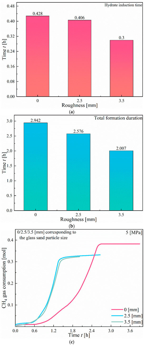 Type X fracture under different roughness: (a) hydrate induction time; (b) total formation duration; (c) gas consumption curve.