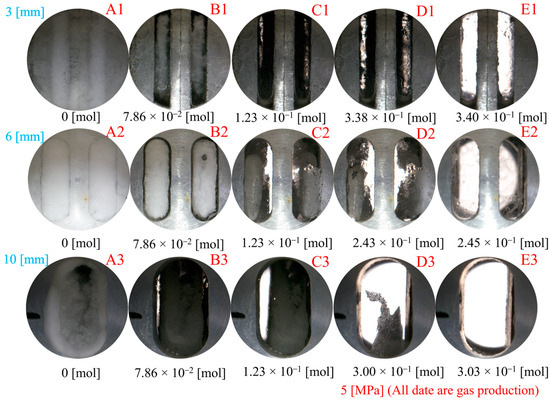 Observation images of hydrate dissociation under different fracture widths: (A1–E1): 3 mm; (A2–E2): 6 mm; (A3–E3): 10 mm.
